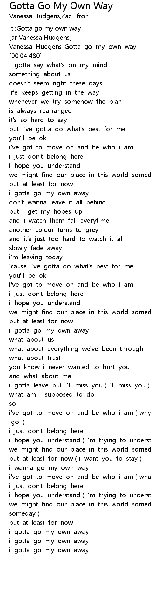 Zac Efron, Vanessa Hudgens - Gotta Go My Own Way (From "High School Musical 2"), We might find a place in this world someday, but at least for now I gotta go my own way! Watch Vanessa Hudgens perform "Gotta . We Have got 11 pics about Zac Efron Gotta Go My Own Way Lyrics images, photos, pictures, backgrounds, and more. In such page, we additionally have number of images out there. Such as png, jpg, animated gifs, pic art, symbol, blackandwhite, pix, etc. ", Disclaimer: This is not the official lyric video ----------------------------------------------------------------------- - I do not own anything - all . "Gotta Go My Own Way(Lyrics), Vanessa Hudgens & Zac Efron", This song is popular during in my Highschool days, and this song is played in Highschool Musical. Love it #lyrics, #music ..
